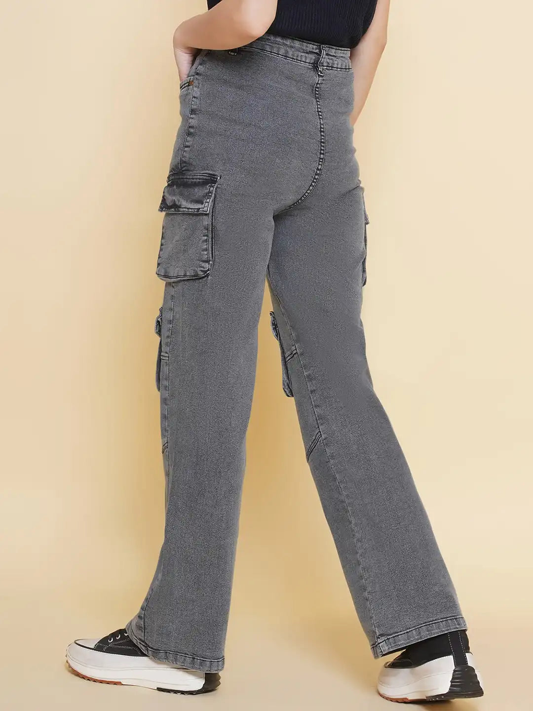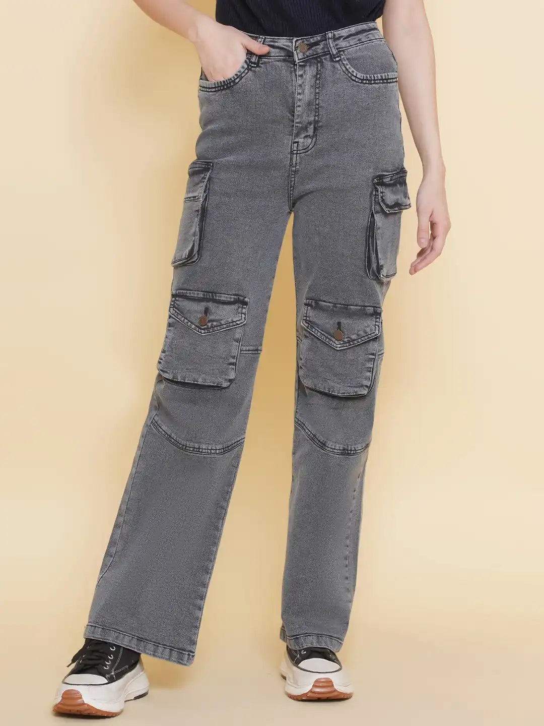 Level up your streetwear game with these edgy grey high-rise cargo jeans — where utility meets modern fashion. Designed with a flattering high waist and relaxed straight-leg fit, these jeans are all about comfort and attitude. Featuring prominent flap pockets on the thighs and sides, they offer both statement style and functional storage, perfect for on-the-go days.