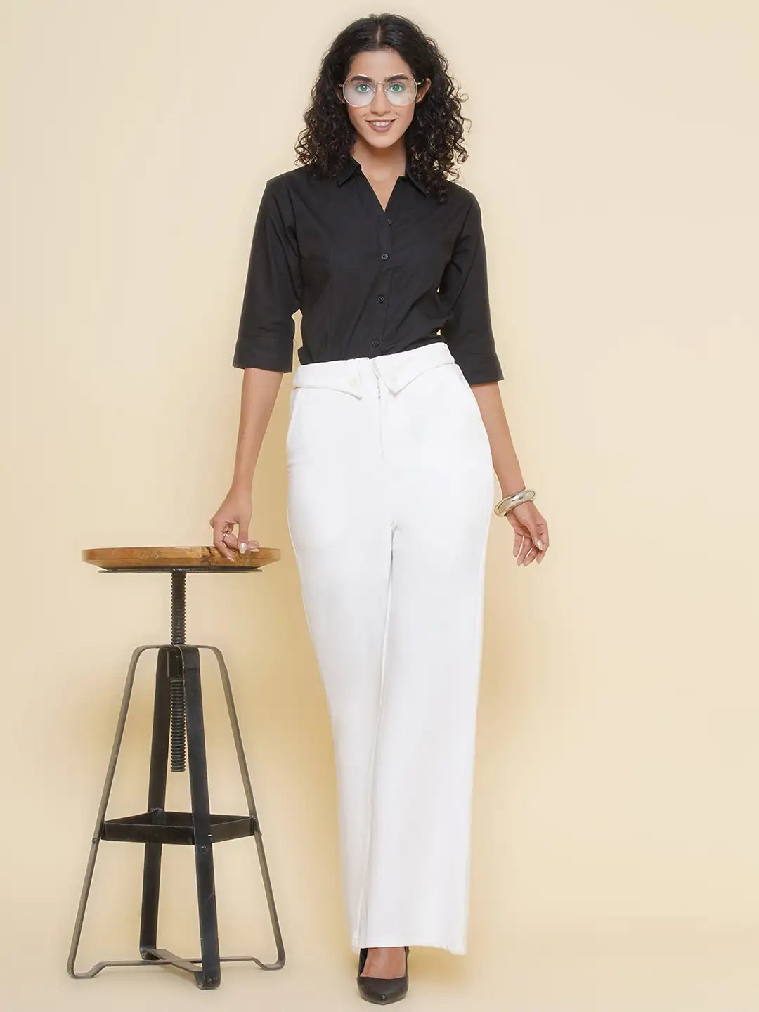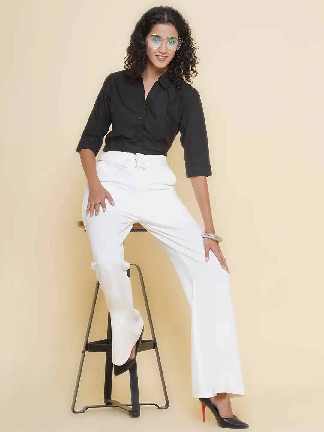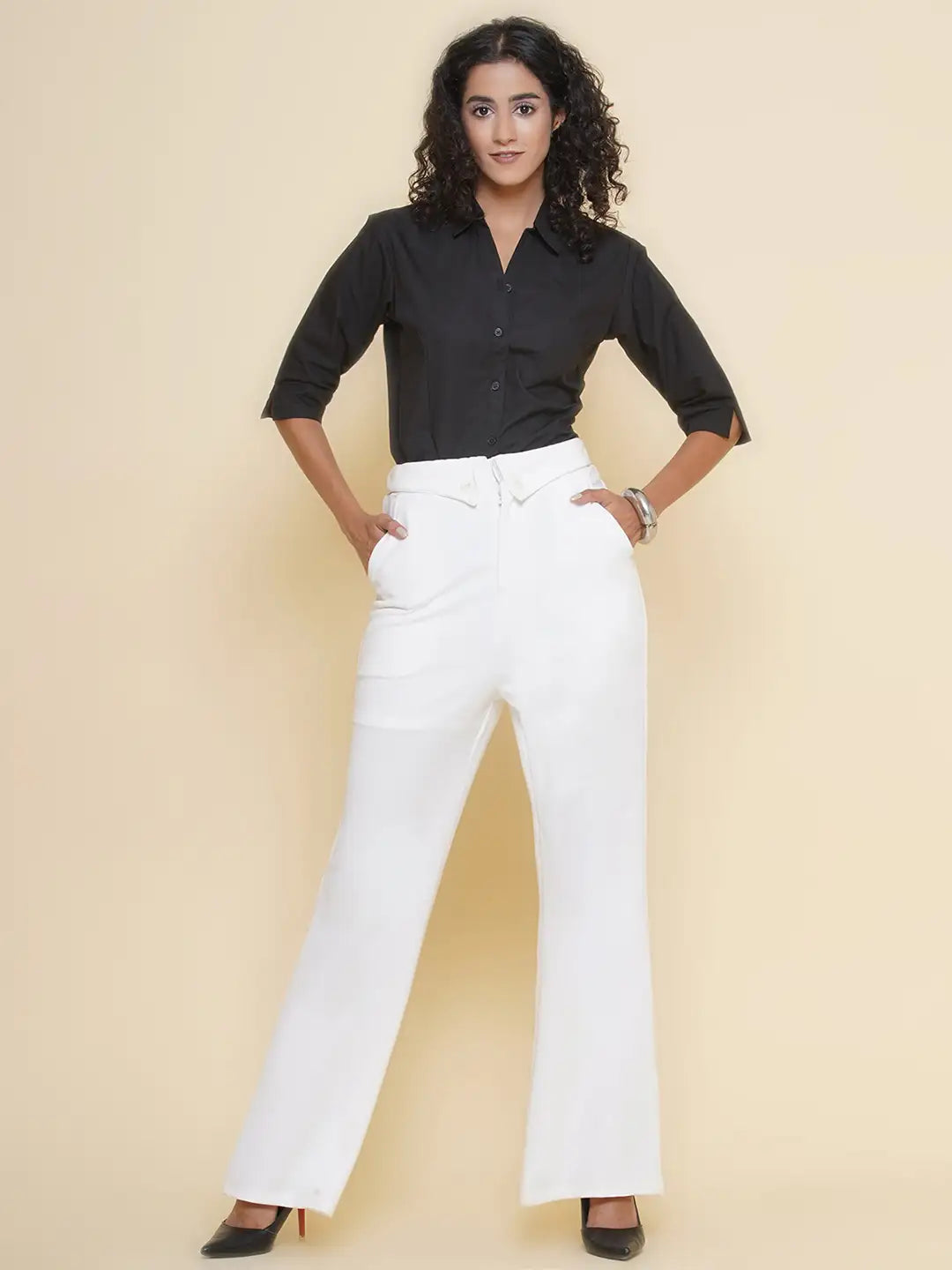 White Flap Waist Bell Bottom Pants, In Kareera Fabric, Polyester...